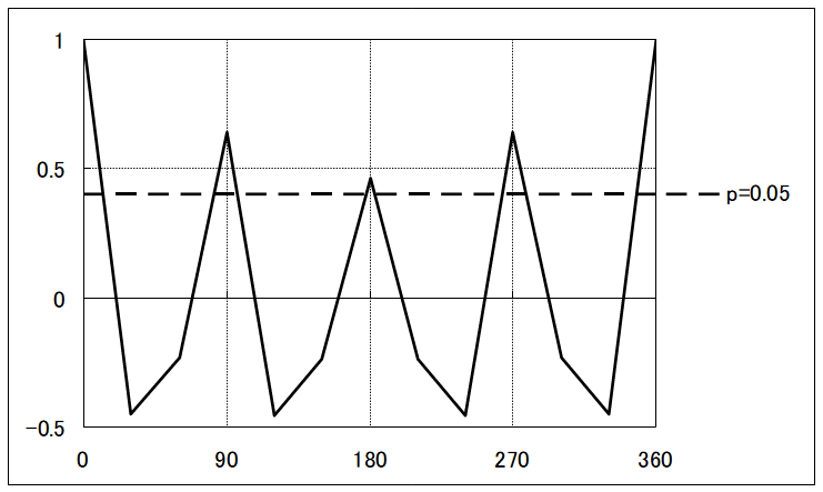 Y軸は相関係数である.p=0.05は12セクタの場合の相関係数の有意性のレベルを示す.周期的にこの値を超えると95%レベルで有意な周期である.このグラフでは90度毎に相関係数がp=0.05レベルを超えている.筆者は,これにより,死亡人数が概年概日リズムの90°の位相に同期していることを確認した.