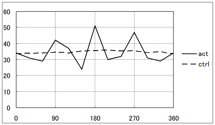 図2は12セクタの連続データについての自己相関係数を表示したグラフである.X軸は,1周360度を30度ごとに12分割した位相を表している.