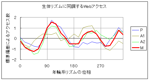 この結果に対し,概年概日リズムとWebアクセス日時とが同期していることを示している,と筆者は結論した.
